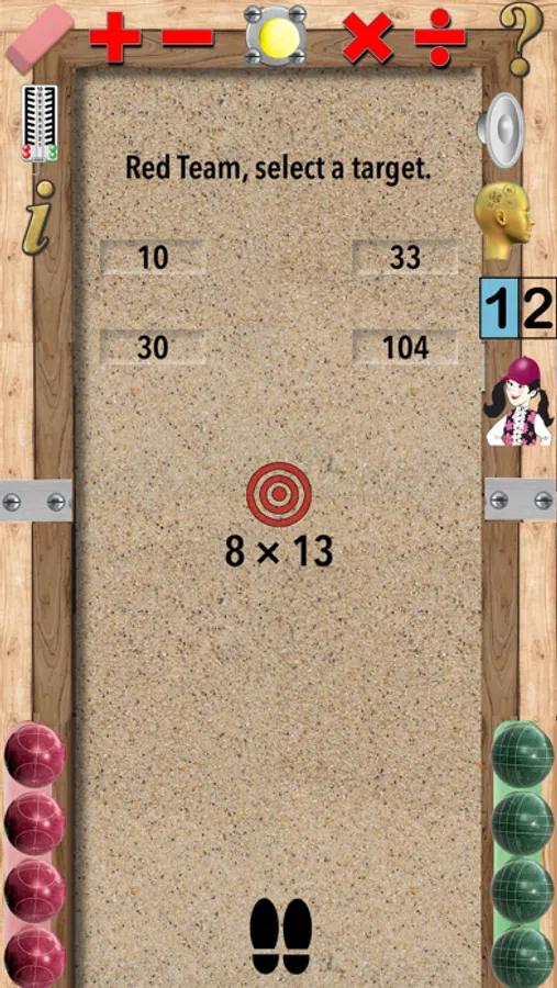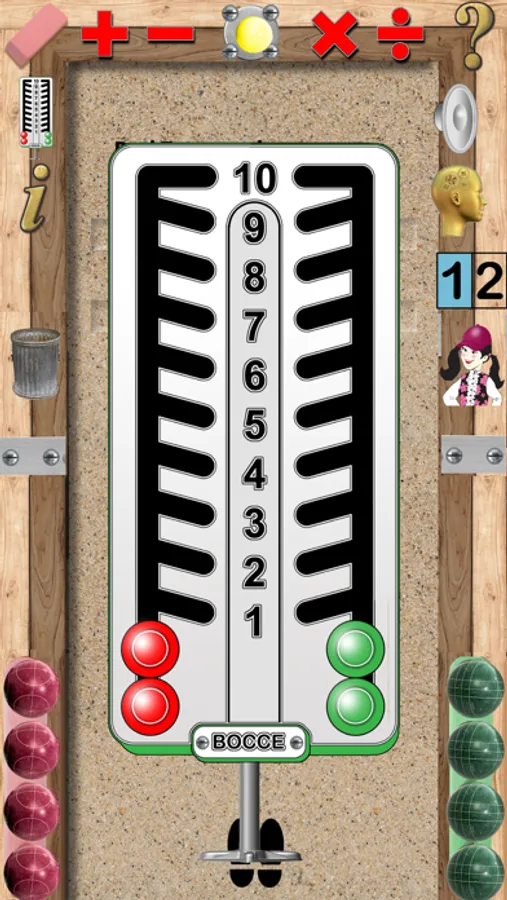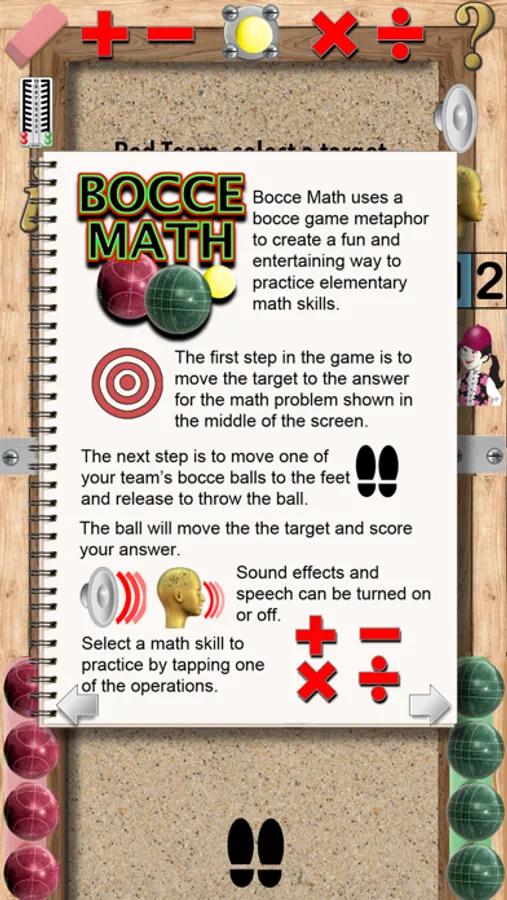 A typical bocce court has a wooden frame and some type of base material (oystershells, artificial turf or sand). There are two teams. One team throws the red balls and the other throws green balls. The object is to get your ball closest to the small yellow ball which is called the pallino. With this iPad/iPhone app students can practice math in a fun and interactive way and just like a real bocce game. Master basic arithmetic (+,–,x or ÷) and become faster a mental math.