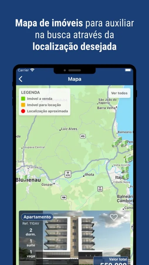 * Mapa com todos os imóveis para auxiliar na busca através da localização desejada;
