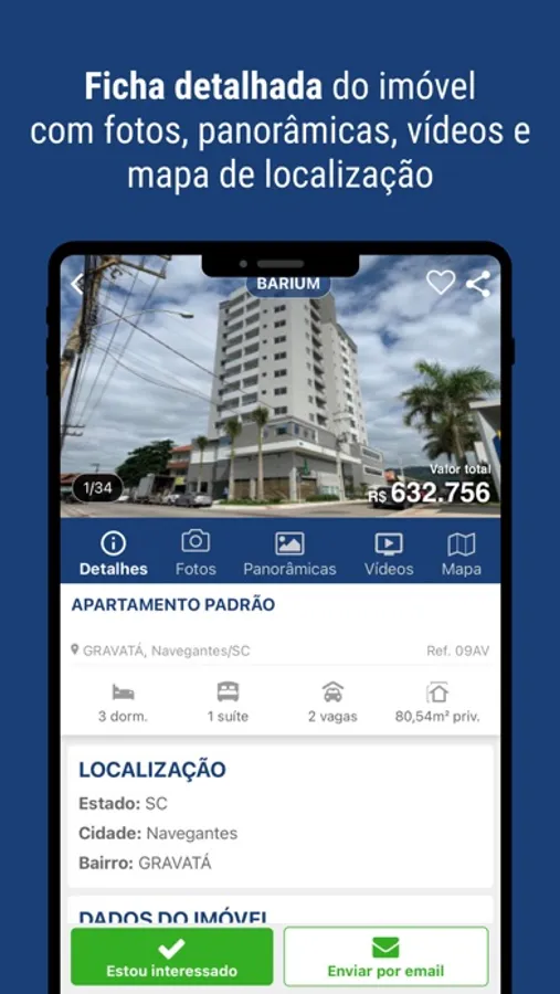 * Informações detalhadas sobre o imóvel, fotos, panorâmicas, vídeos e mapa de localização;