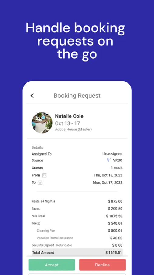 - Central Calendar: Get a snapshot of your reservations in a flash. Tap on any reservation to see the guest's name, price breakdown, and stay details. Quickly switch to the Inbox with another tap.
