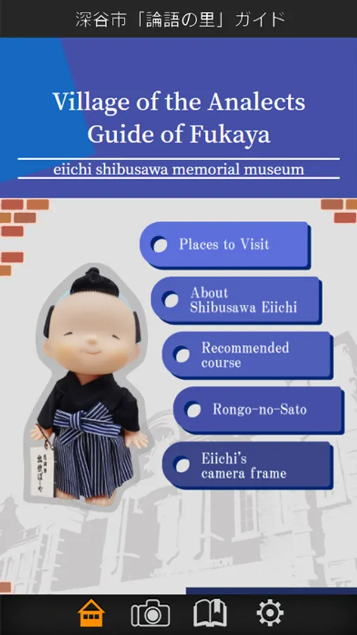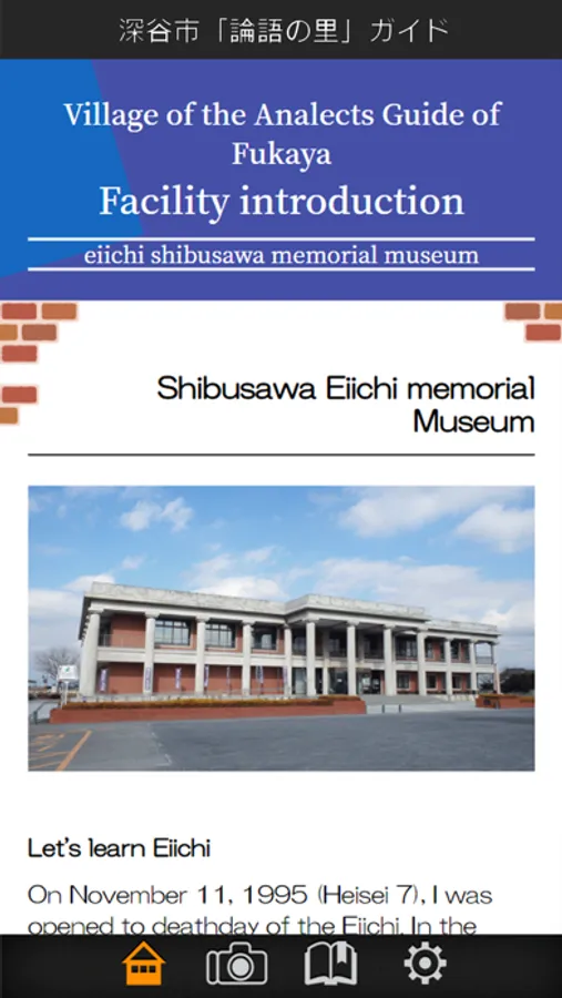 The Official strolling app of Shibusawa Eiichi memorial Museum in Fukaya City, Saitama Prefecture. A detailed navigation service, which also introduces fascinating spots around the city, especially places connected to Shibusawa Eiichi Rongo-no-Sato (Village of the Analects of Confucius), originally from Fukaya City. App has a function that shows recommended routes connected to Shibusawa Eiichi, to navigate the city, and shows recommended routes on a map. Another function worthy of note is the ability to search for desired spots.