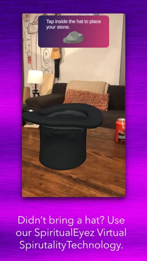 ***NEW*** Don't have a hat? Don't worry, now you can see one with your spiritual eyes with our new SpiritualEyez(tm) Augmented Spirituality technology. Place your spiritual hat on any flat surface in the real world and put your phone into the top of the hat as if it were your face.
