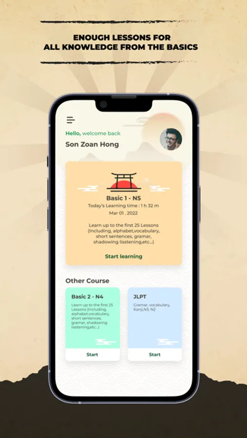 - Courses: This is a Japanese learning app of courses and practices from Basic to Advanced, from N5 to N2, including the following skills: Listening, Pronunciation, Grammar and Vocabulary.
