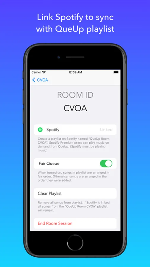 • Connect your Spotify account to sync QueUp playlist to a Spotify playlist
