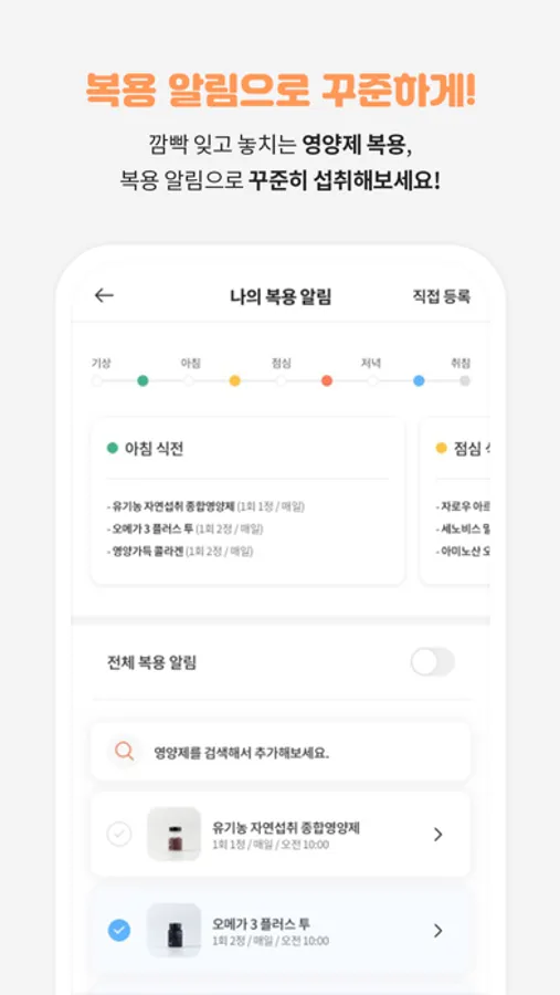 영양제 알림을 설정하여 정해진 시간에 규칙적으로 복용하실 수 있도록 도와드립니다!