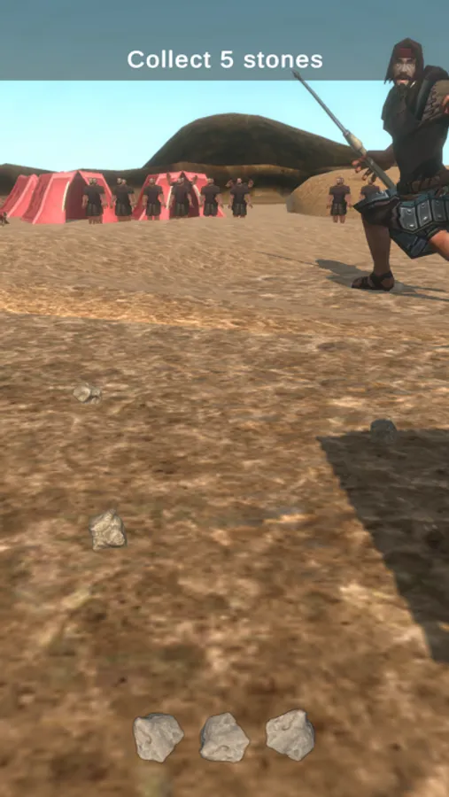 This Augmented Reality app allows you to walk through a portal in the digital realm as you come face to face with Goliath. You need to find 5 stones on the floor by following the instructions on the screen. Once you have collected the stones you then angle your phone (thinking wind, speed and distance) and flick using your finger moving it in a fast motion. Make sure you are holding tight to your phone as you flick a stone at Goliath's head. Once Goliath is hit on the body you will see his health decrease. If you hit his head it is a direct hit and Goliath will fall to the ground and you will have victory.