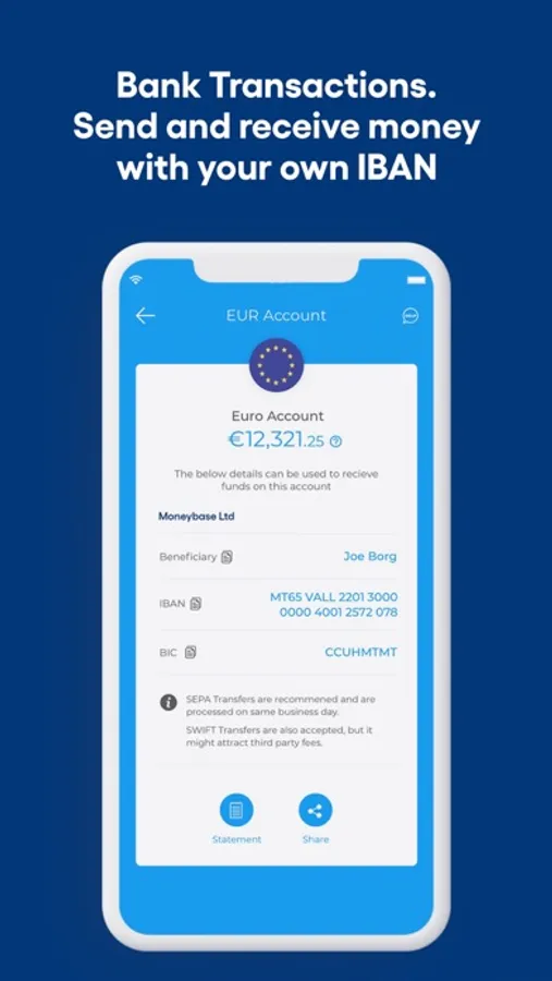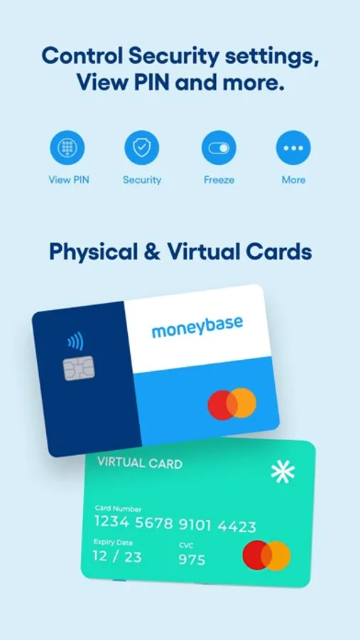 Full in-app control of your physical or virtual cards - Thanks to our safety features and controls, you can freeze, unfreeze or cancel your card whenever you wish. You can even set up customized permissions and restrictions such as ATM withdrawals, Online Payments or Swipe payments or view your PIN directly from the Moneybase app! Generate your virtual card instantly or order a physical contactless card.