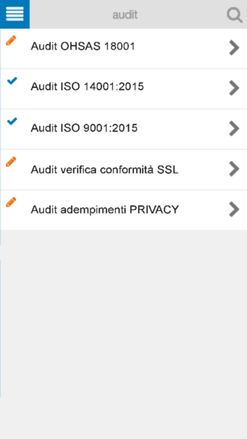 Pianificazione; Creazione e duplicazione modelli di check-list da associare agli audit; Gestione delle pianificazioni aziendali su libreria cross Q-81; Importazione delle pianificazioni aziendali da cross Q-81 per le check-list cross e in quelle aziendali; Spostare le domande di nodo o cambiare l'ordine in compilazione; Aggiunta/Cancellazione domande in fase di compilazione; Gestione check-list bloccate/libere; Gestione disattivazione delle domande e di nuove domande per i modelli bloccati; Stampe personalizzate avanzate nell'audit; Stampa del modello check-list con tutte le risposte alle possibili alle domande; Stampa della domanda / risposta singola con tutti i collegamenti doc collegati e foto; Gestione confronto: pagina per scegliere le check-list e pagina risultato del confronto; Duplicazione delle risposte al duplica check-list; Raccogliere metadati (foto, documenti, video, note vocali) durante l’audit; Avviare segnalazioni ed azioni da ogni singola risposta alle domande delle check-list; Disporre di funzionalità di pesatura delle risposte (punteggio, criticità, accettabilità); Totalizzatore compilazione e alert al salvataggio con gestione dello stato.