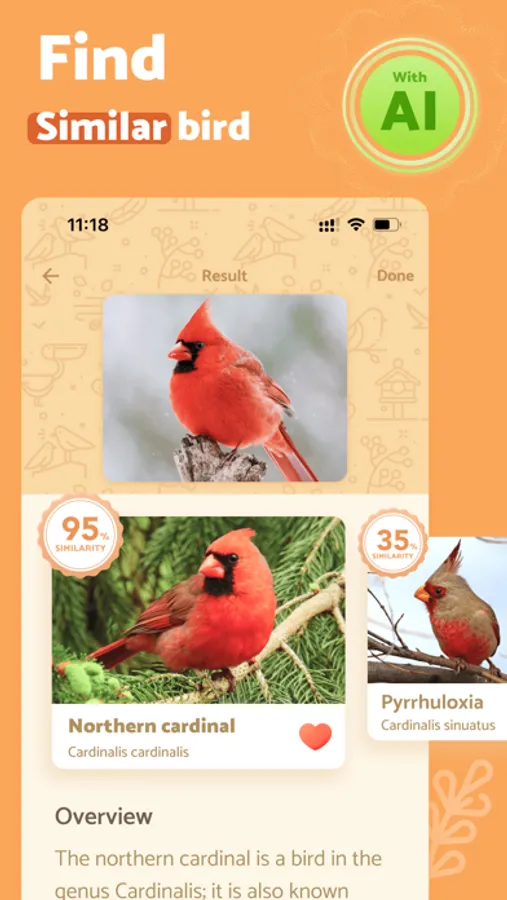 Just take or upload a photo of bird, BirdScan can quickly identify the bird and show you the detailed information. The powerful AI fuzzy search function can also help you find other similar bird.