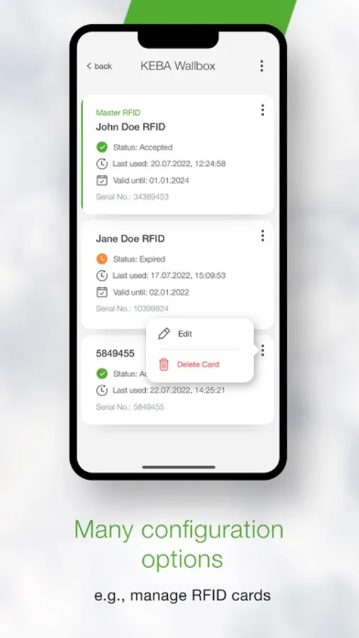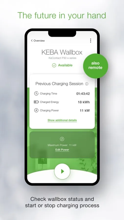 The KEBA eMobility App is a digital service for KeContact P30 users (x-series, company car wallbox, PV EDITION and c-series). The App allows you to communicate with the charging station as well as to manage and configure it. It gives you full control over your wallbox – simply with your mobile device.