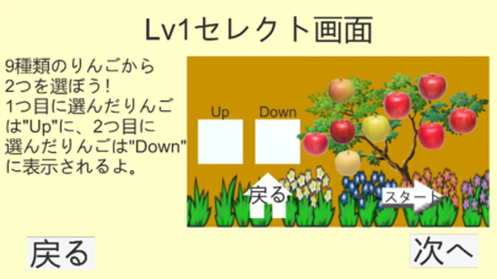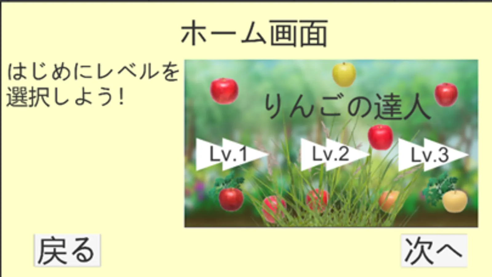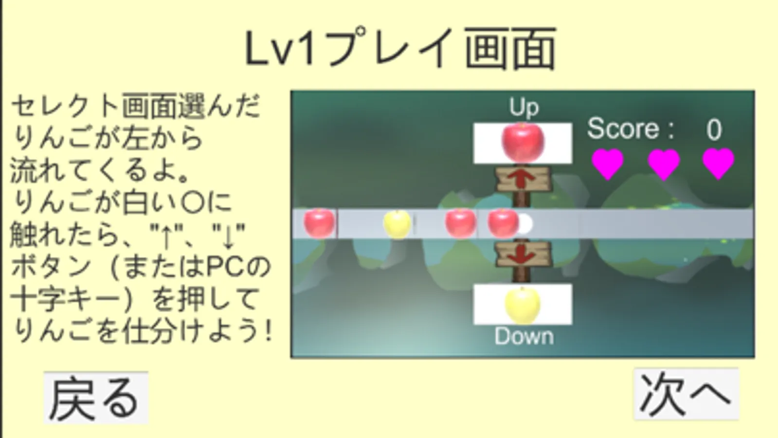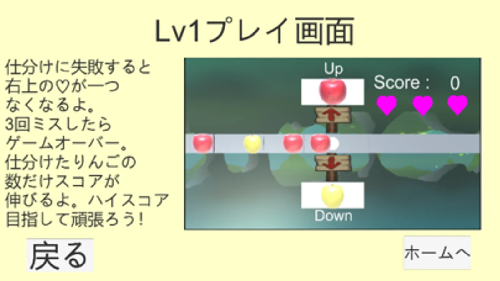 様々な種類のりんごをボタン(または十字キー)で仕分けるリズムゲームです。