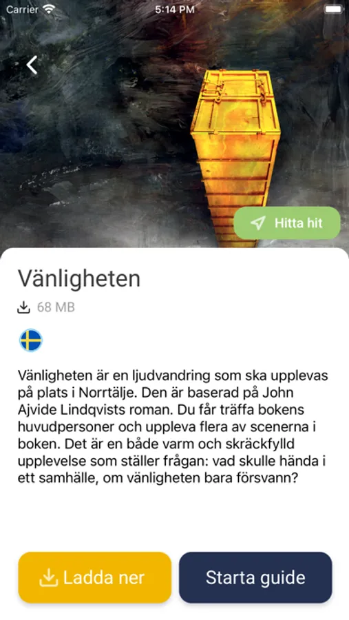 Under en dryg timme får du uppleva delar av romanen, på de platser där boken utspelar sig. Berättare är Vinden – som spelas av Ia Langhammer. Ljudlagda scener varvas med utdrag ur boken som John Ajvide Lindqvist själv läser. Och naturligtvis får du också njuta av Håkan Hellströms musik som spelar en viktig roll i romanen.