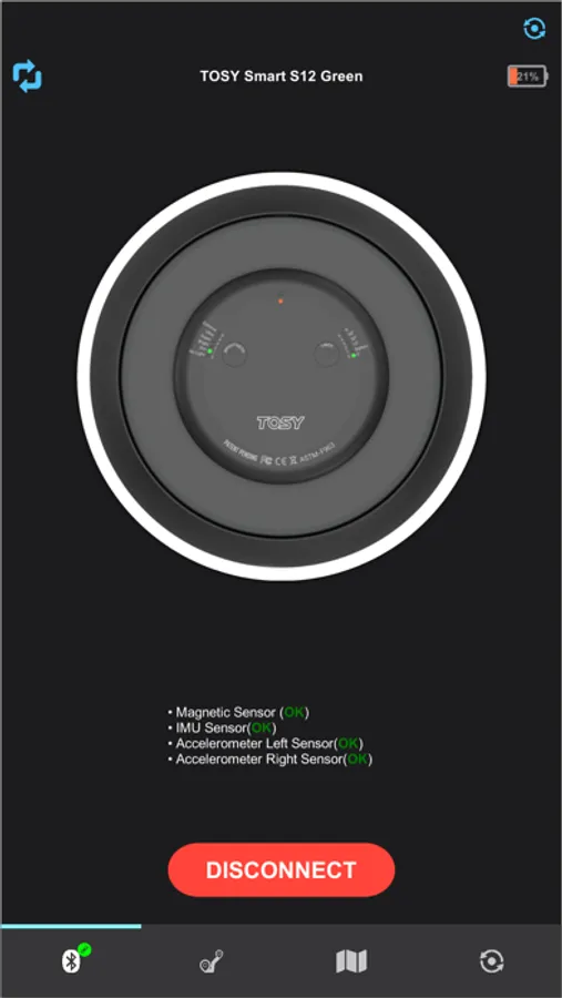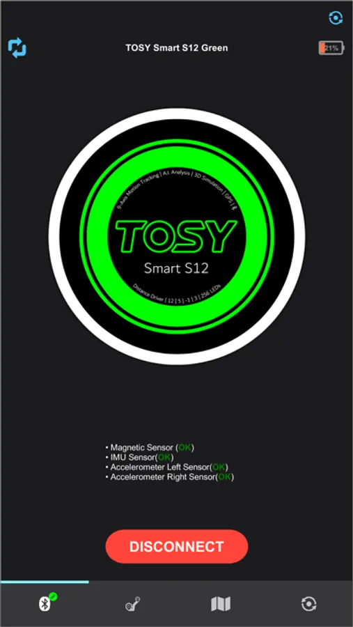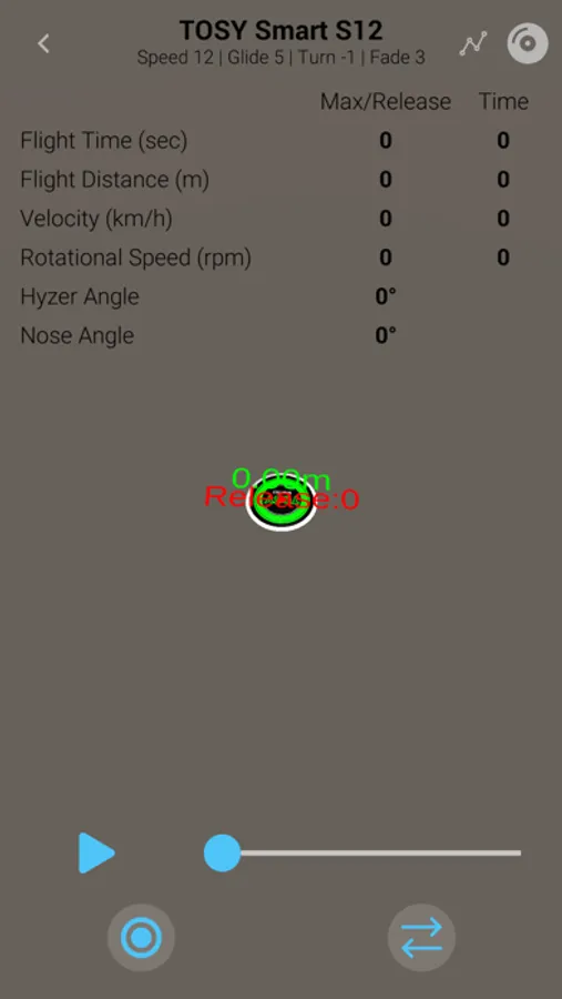 * Connect your TOSY Smart Golf Disc with the app via Bluetooth and see real-time data of your performance, including flight time, distance, velocity, rotational speed, hyzer angle, and nose angle for each throw.