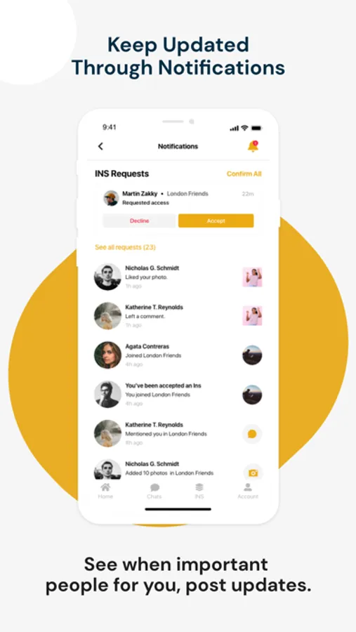 Get closer to your inner circles by letting each other know what is happening - in real-time. With INS, you will never miss anything important happening in your inner circles. You will be the first to know the latest update.