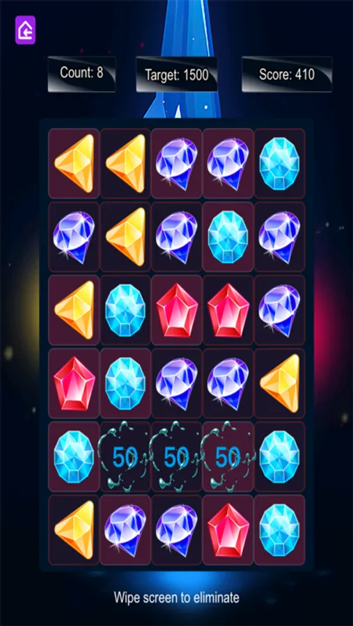 钻石消消消是一款休闲的小游戏,连接相同钻石可以把他们消除掉获得积分。达到积分可以过关