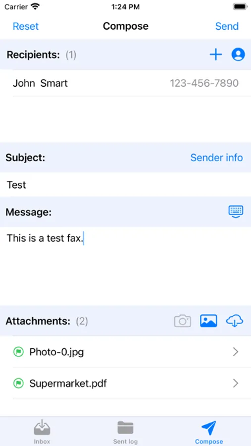 - Compose and send faxes, including cover page and file attachments to fax numbers
