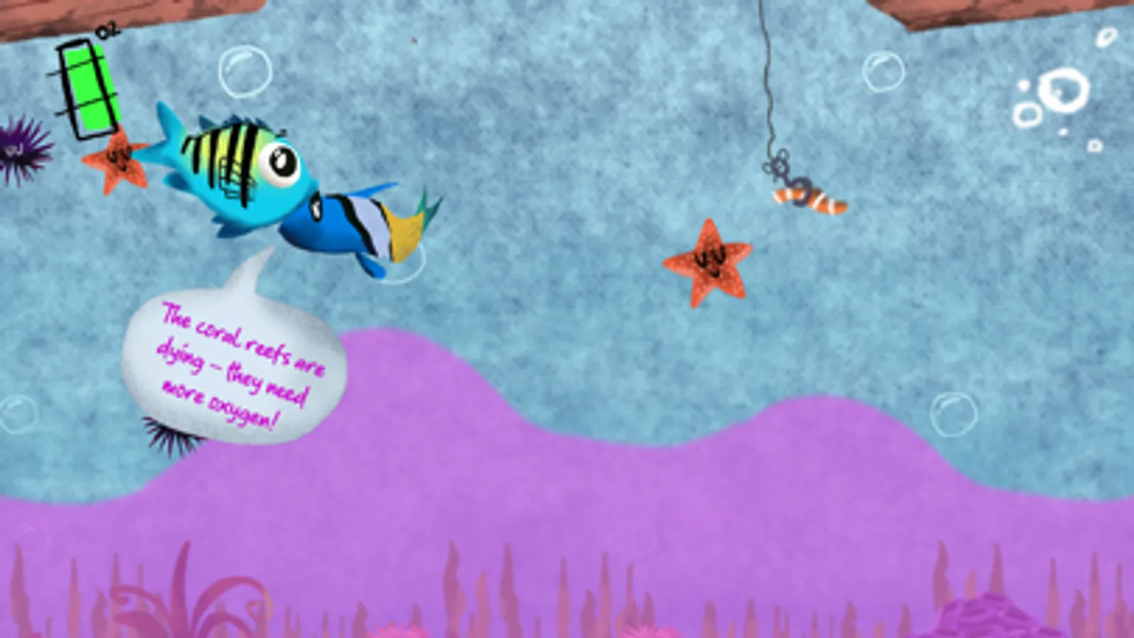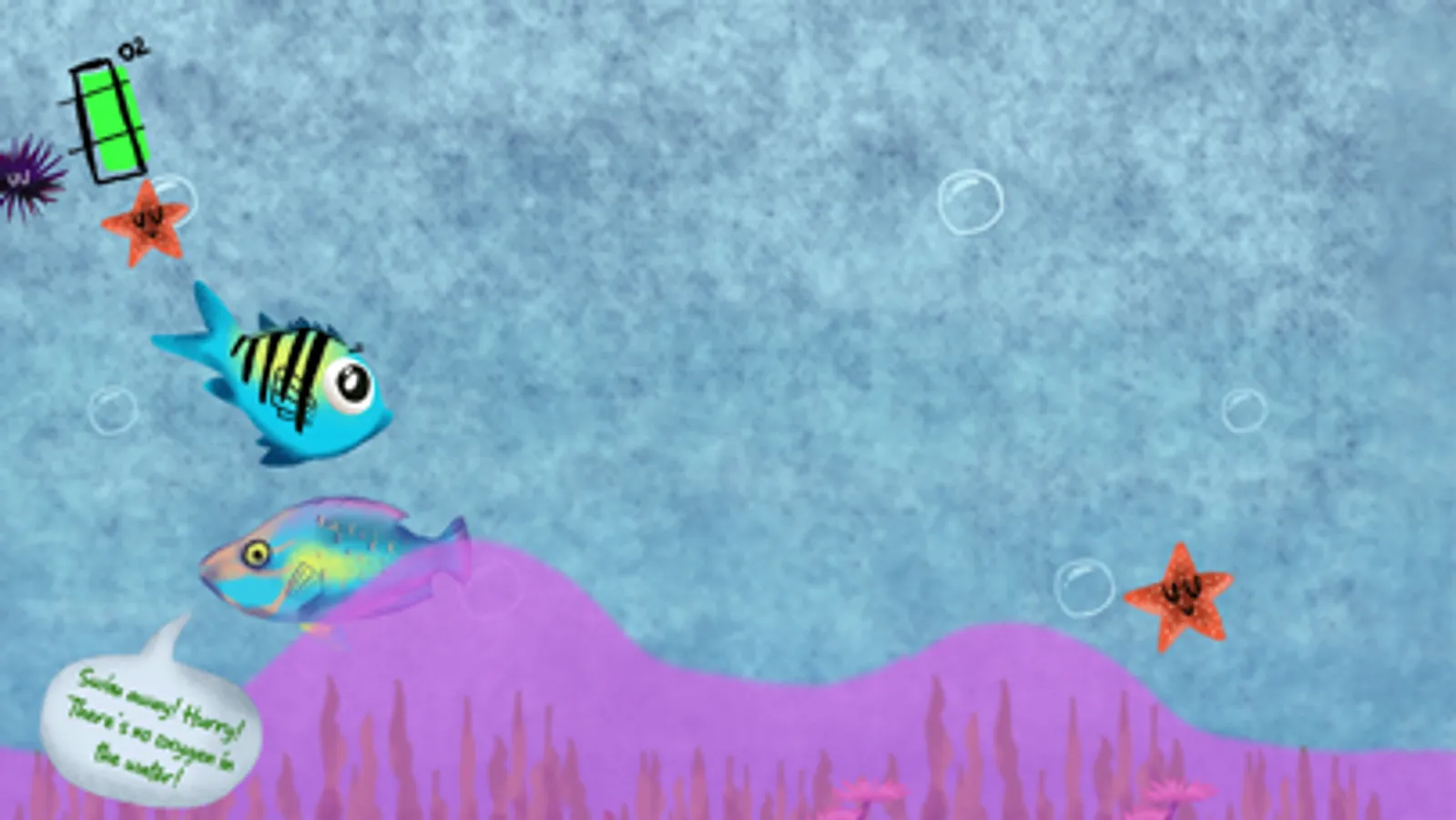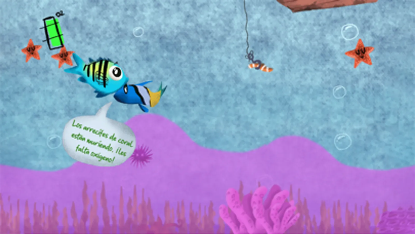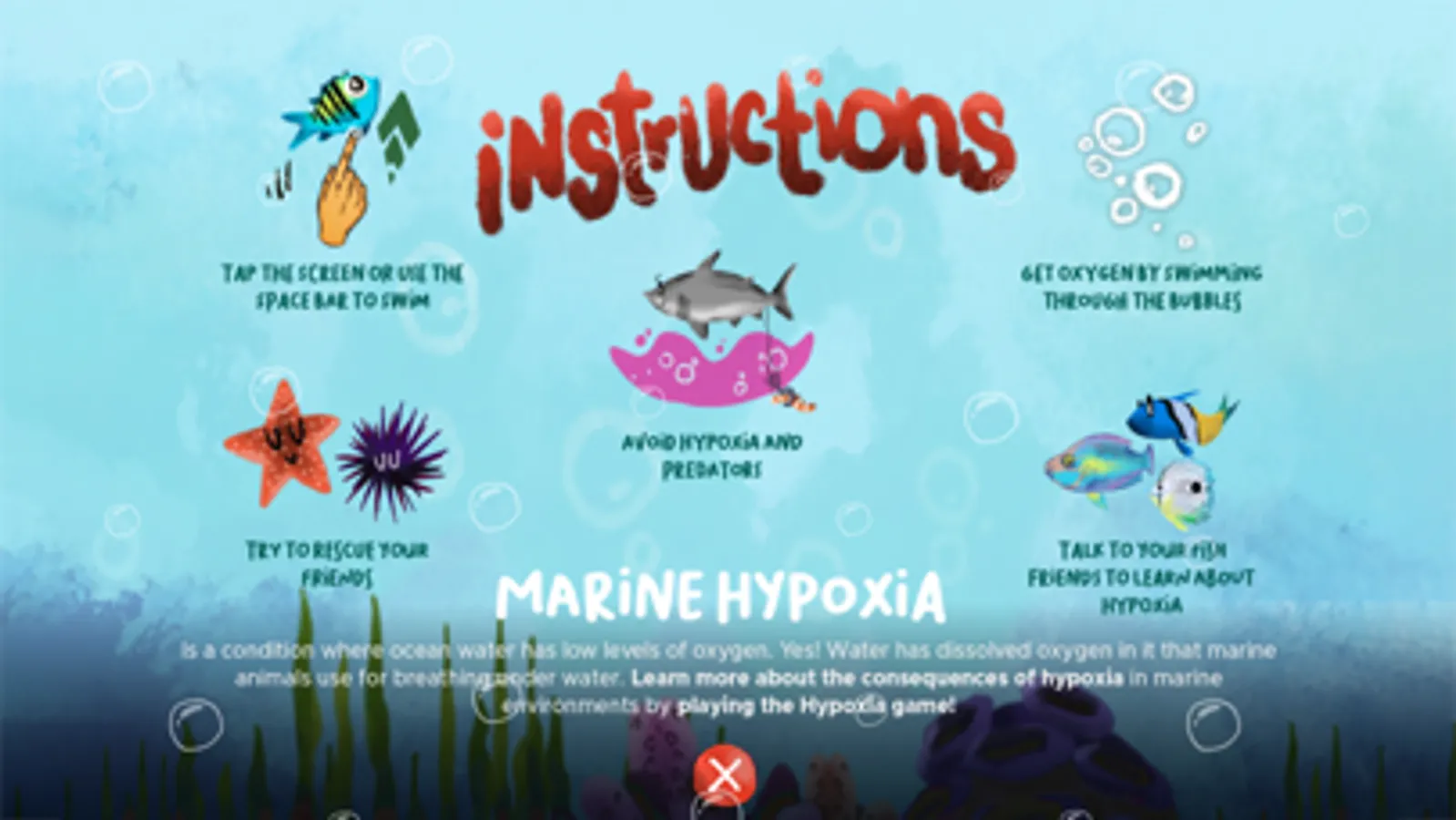 El agua marina tiene oxígeno, ¡pero puede agotarse! La hipoxia marina a menudo ocurre cuando los humanos contaminan el agua; algunos animales pueden alejarse nadando como los peces, pero los animales lentos, como los erizos de mar, no pueden moverse lo suficientemente rápido. ¡Ayuda a nuestro héroe, el sargento mayor, a escapar del agua con poco oxígeno y a salvar a sus amigos del peligro, sin ser devorado por sus depredadores!