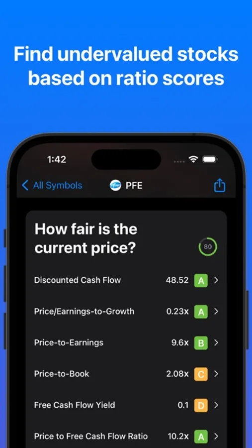 Stock Analyzer allows you to create a personal list of stocks you want to follow. Fundamentals like DCF and PEG ratios are scored against ranges to quickly indicate whether a stock is undervalued or overvalued. Track 30000+ stocks, analyze, and find your following stock to buy.