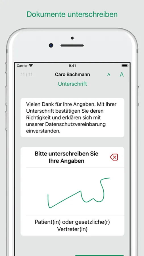 Zusätzlich zur Unterschrift schicken Sie Ihren Patienten einen SMS-Code auf Ihr Handy, der bei der Unterschrift eingegeben wird. So wird der Patient zusätzlich persönlich identifiziert. Alle relevanten Unterschriftsdaten zum Formular werden in teemer unveränderbar gespeichert, sodass Sie die Unterschrift jederzeit nachweisen können.