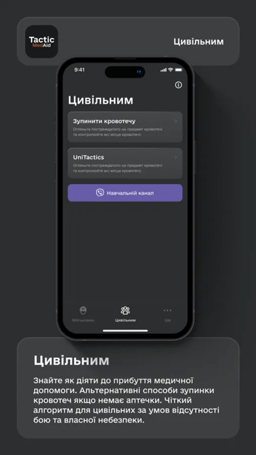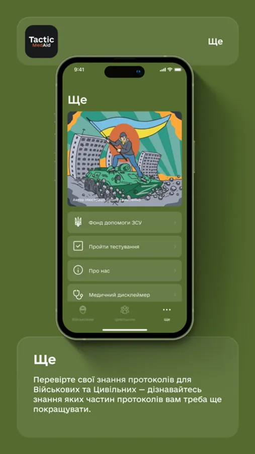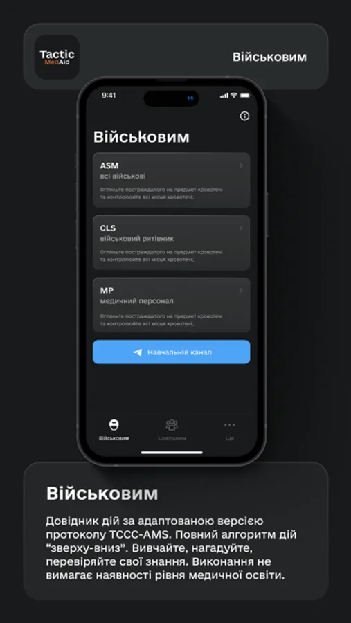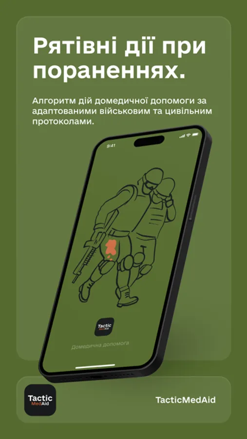 Одразу після встановлення TacticMedAid ви отримуєте повний довідник з адаптованою версією протоколу TCCC-AMS для військових та протоколу STOP THE BLEED для цивільних.