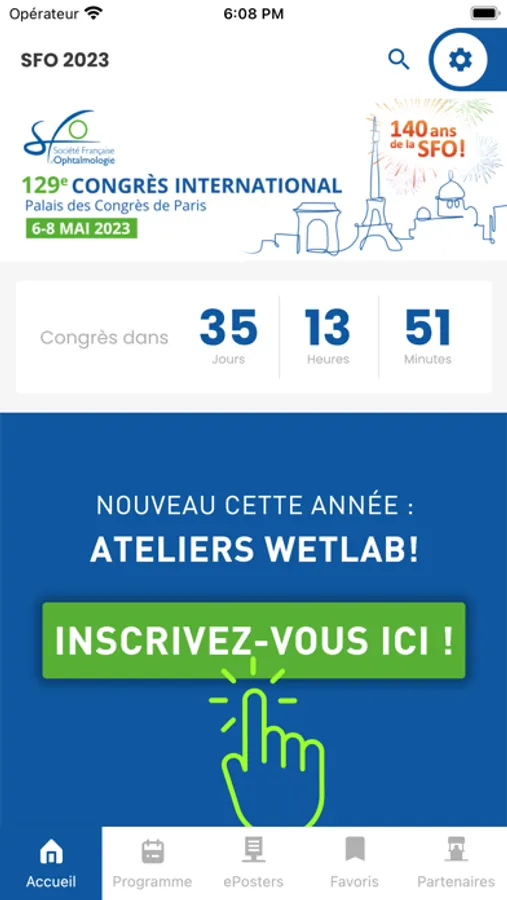 Application officielle du 129e congrès de la Société Française d’Ophtalmologie, du 6 au 8 mai 2023 au Palais des Congrès de Paris.Explorez l'application et ses nombreuses fonctionnalités :