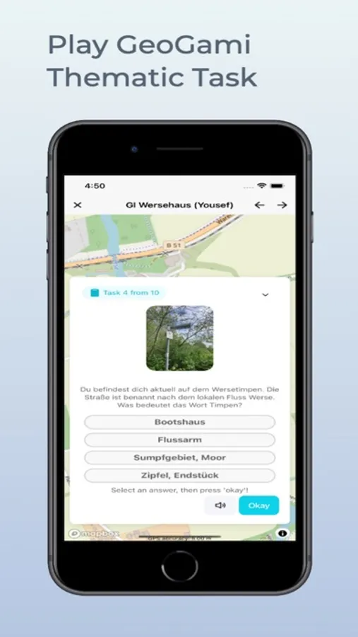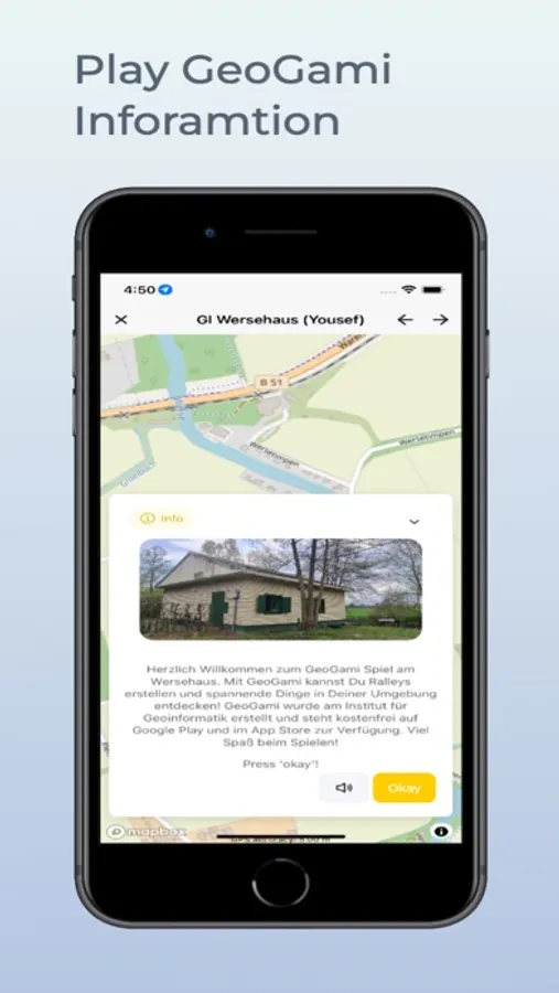 GeoGami ist eine App, zum Erstellen und Spielen von kartenbasierten Games und eignet sich insbesondere für den Einsatz an Bildungseinrichtungen. Die Entwicklung der App wird vom Insitut für Geoinformatik der Westfälischen Wilhelms-Universität Münster wissenschaftlich begleitet und didaktisch konzeptioniert.