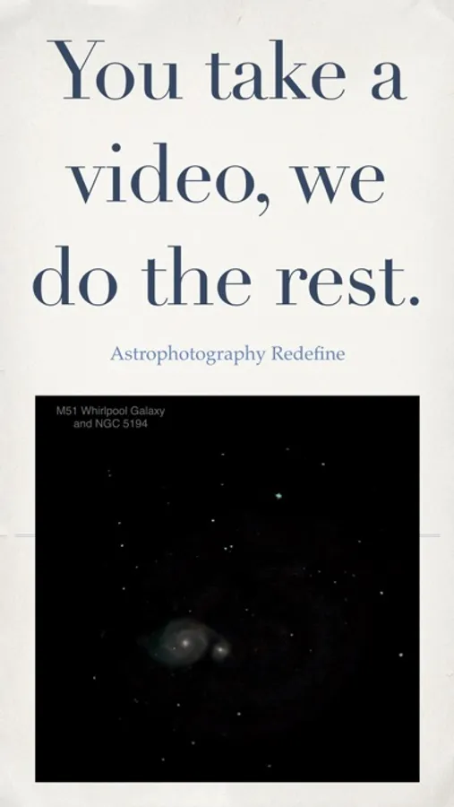 Currently it is expensive and time consuming to do astrophotography. In the simplest setup, you need to buy a tracking mount because of the Earth rotation. You need special camera to take interval shot of the sky. Then you need to upload these photographs to desktop software to align and stack them. Now you have a new way to photo deep sky object. You take a video and we will do the rest! The app includes 3 demo videos. The Milky Way video is taken by Daniel Mendell. And the M31 and M42 video is taken by the developer.