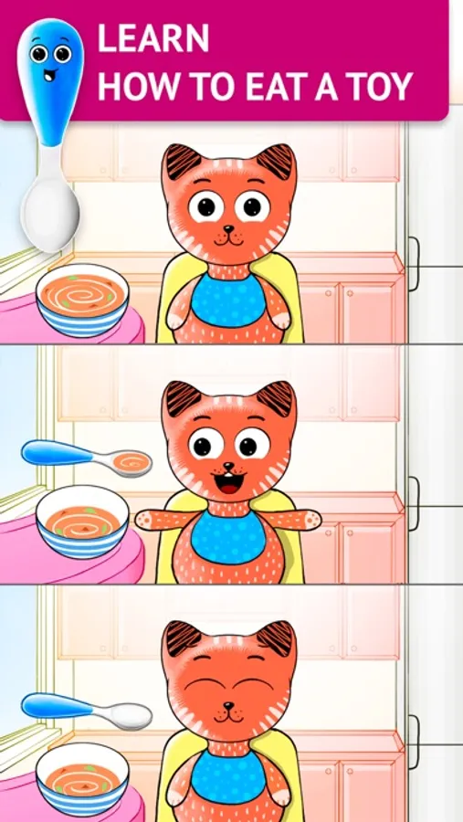 - Need external helper to learn to eat? Here is baby kitty toy. So here baby pet games takes a new level. This baby Kitty will learn your toddler how to eat.