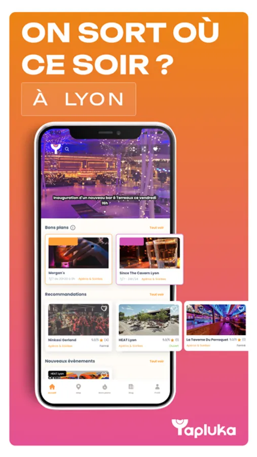 YaPluKa, c’est l’appli gratuite qui te recommande les meilleures Sorties, Soirées, Evènements à Lyon, 100% en fonction de tes goûts au meilleur prix.