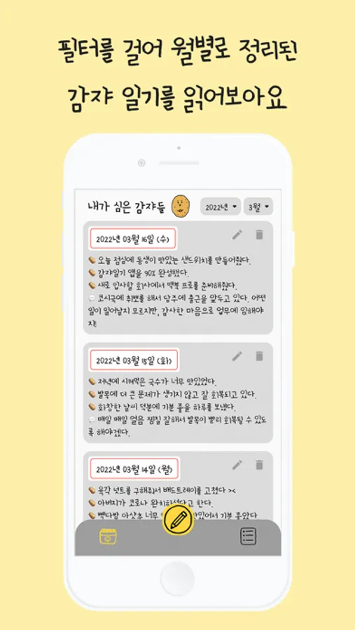 타임라인 뷰에서 '월별 필터'를 걸어 내가 쓴 감쟈일기를 한눈에 살펴볼 수 있습니다. 기록들을 돌이켜보며 어떤 일에 감사함을 느꼈는지 확인해보세요. 소소한 감사들이 모여 행복이 될 수 있기를 바랍니다.