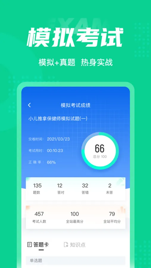 小儿推拿保健师题库内含考点练习,全国通用卷以及地区卷模拟练习,以及按照固定考试比重的随机式的抽题的真题考场,成绩单实时记录考试数据,一点一滴的反馈考生近期学习状态以及自我正确率的提升,大大的给予考生通过考试的信心。