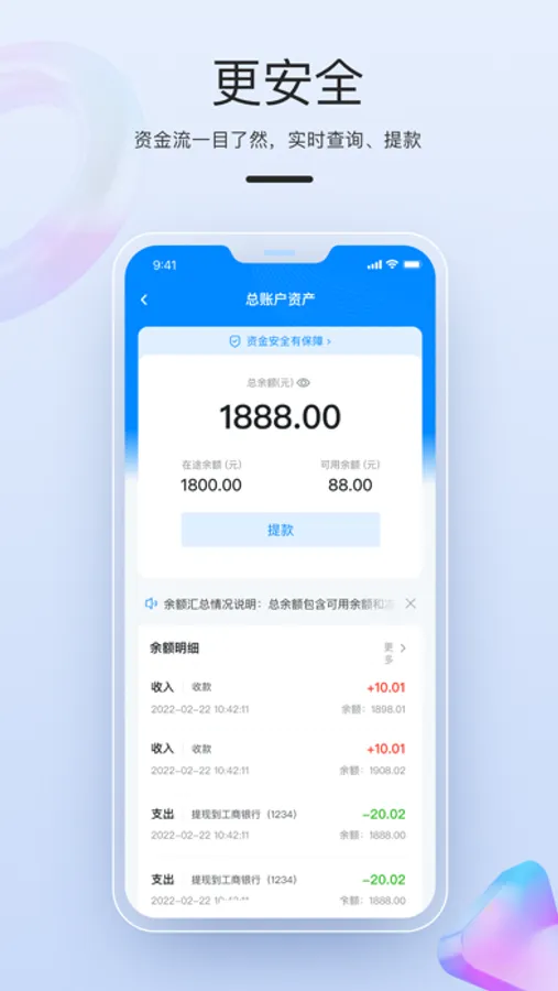 · 自助管理提现银行卡,自定义提现方式,加快资金周转。