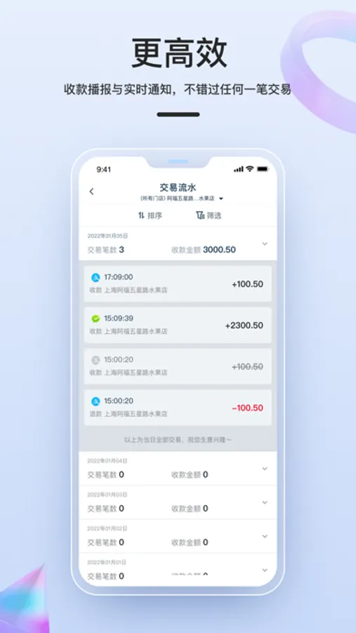 · 支持多维度的经营统计分析,生意账单、动态趋势、交易流水一目了然。