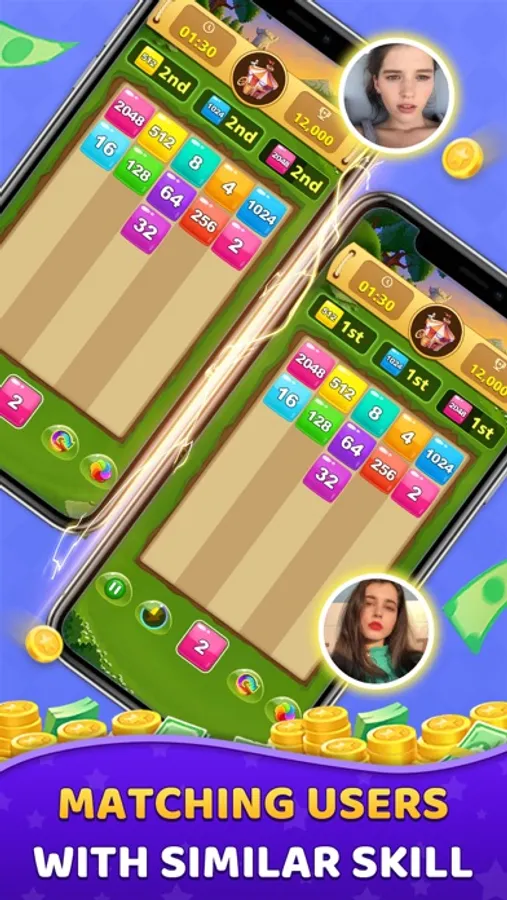 2048 Clash is a classic 2048 Cash Game! You'll be matched with real players within the same skill level, and the game is totally fair and skill-based.