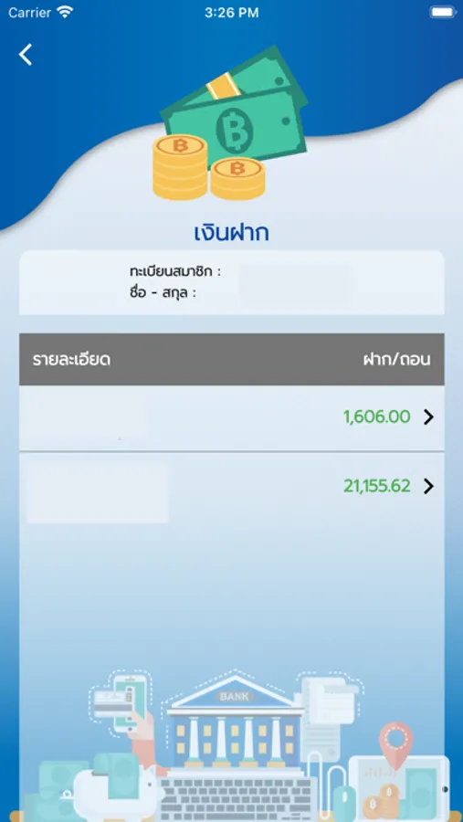 - ยอดคงเหลือเงินฝาก และรายการเคลื่อนไหวของบัญชี