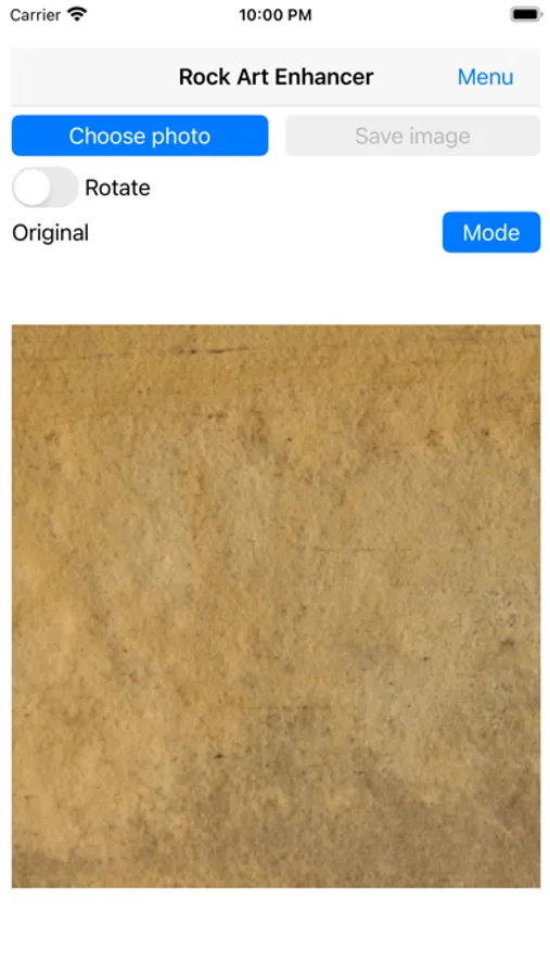 The live enhancement mode lets you hold your phone over a possible site of rock art and enhances the colours in real time to help you see what's there. In this mode, you can cycle between the different enhancement techniques, and toggle the flash on/off to make it easier to view art in dark rock shelters.