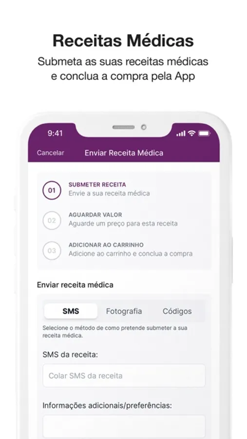 • Aviar as suas receitas médicas de forma simples e eficaz;