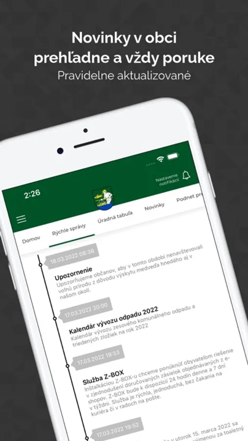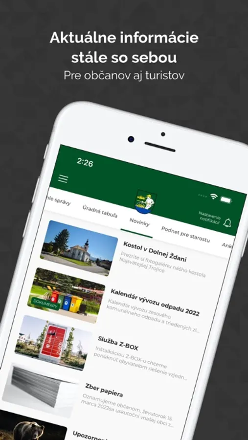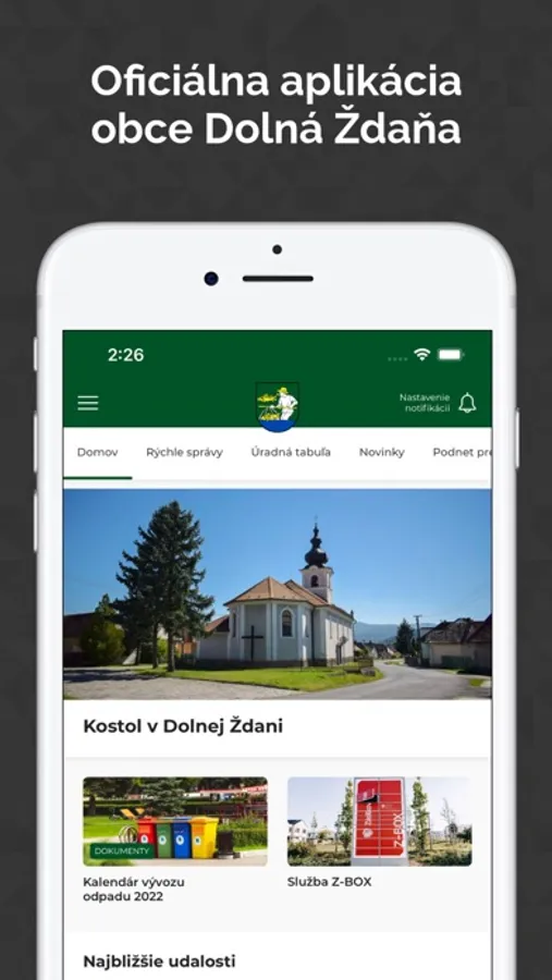 Mobilná aplikácia obce Dolná Ždaňa. V aplikácii nájdete aktuálne informácie z diania v obci, kalendár, dôležité kontakty aj top lokality. Môžete si nastaviť upozornenia na rôzne udalosti, od noviniek, cez udalosti kalendára až po denné sumáre. Obec Vám v prípade kritickej situácie (napr. povodne) môže poslať upozornenie priamo do aplikácie.