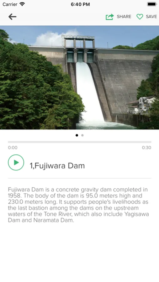 This is the official guide app of the Ministry of Land, Infrastructure, Transport and Tourism's Tone River Dams Integrated Control Office. It provides information about the facilities and sights of the four upstream dams on the Tone River (Fujiwara Dam, Aimata Dam, Sonohara Dam, and Yamba Dam), in Japanese, English, and Chinese audio and pictures.