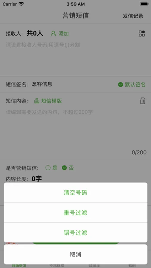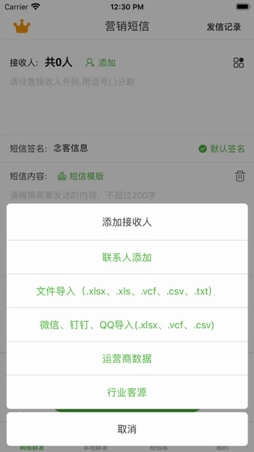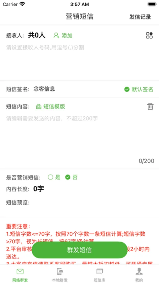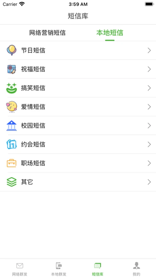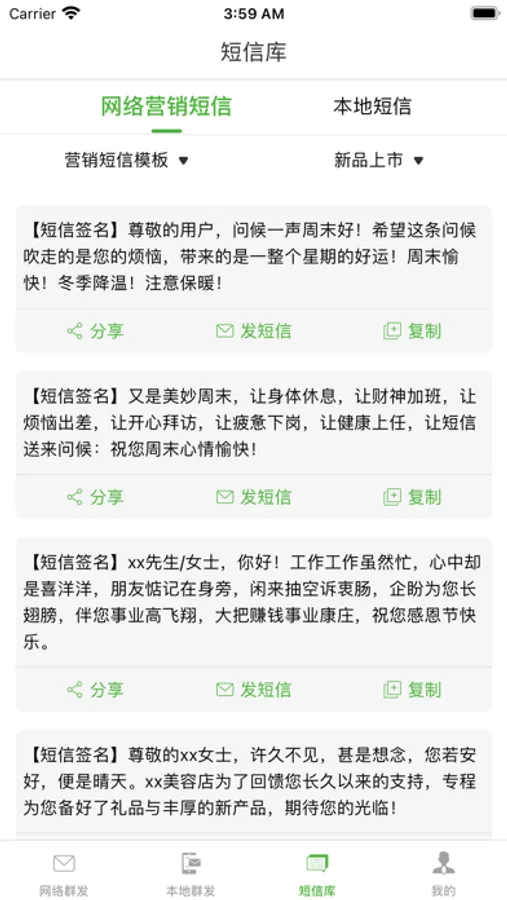 短信群发App提供了海量的短信模版供您使用,不管您是短信营销、会员营销、通知短信、行业短信、节日短信、生日短信、爱情短信、日常生活短信、节气祝福短信,总能找到适合您的短信模版。