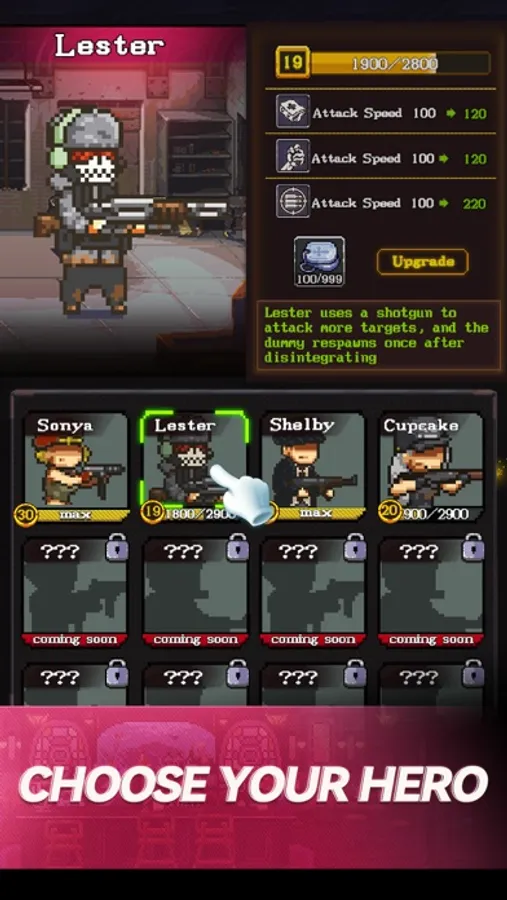 Zombie Fighter is a pixel survival game, gear to alive. Choose your hero and weapon as you want to defense zombies, fight with them while avoiding their attack. Using your strategy to select talent and upgrade your equipment to the next level.