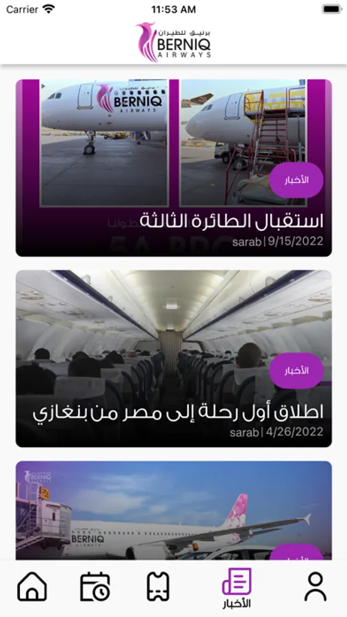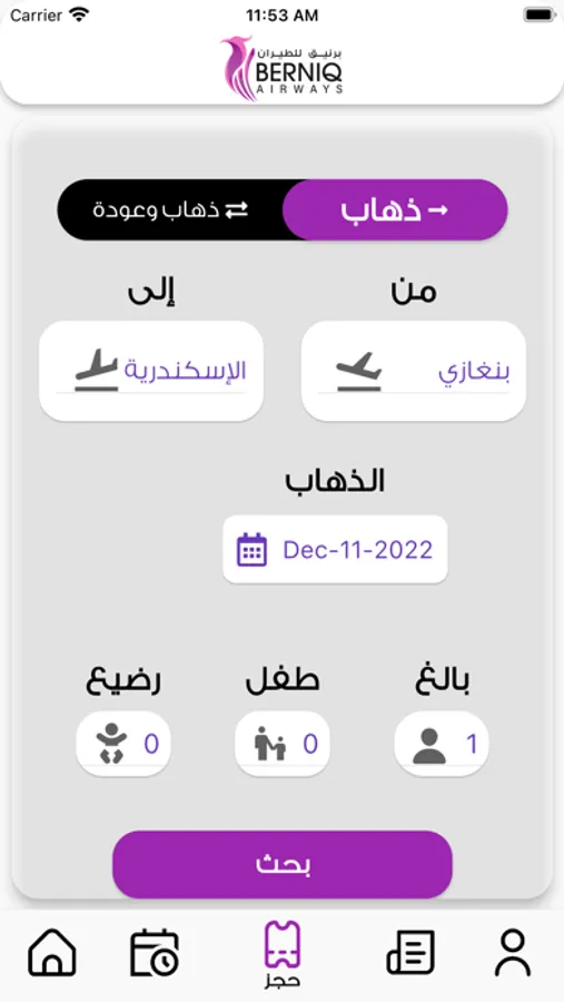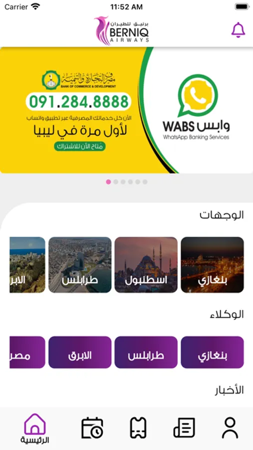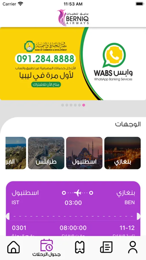 تطبيـق برنيــق للطيـــران ، الأول من نوعه في ليبيا،حيث يُتيح لك حجز تذكرتك حسب وجهتك ذهاباً و عودة دون الحاجة لترك مكانك ويمكنك من خلال هذا التطبيق أيضا تسديد قيمة حجوزاتك بوسائل الدفع الإلكترونية المتاحة ً، كذلك يمكنك تتبع مسار رحلتك و مواعيد الرحلات المحلية والدولية و الإطلاع على كل المُستجدات والأخبار .