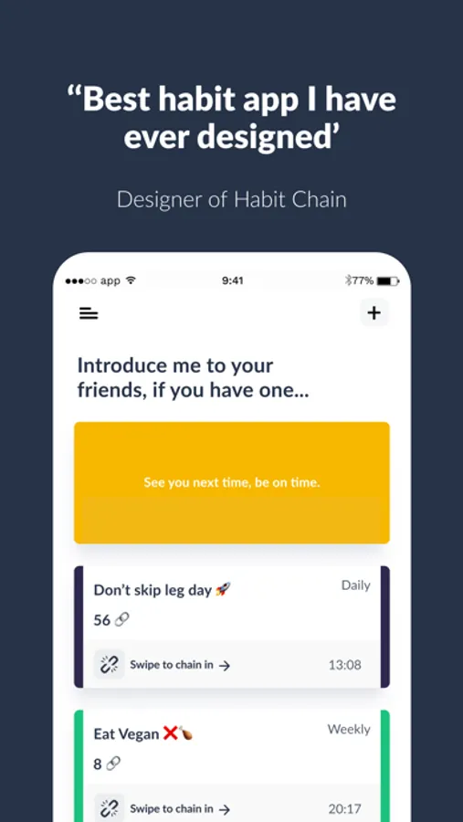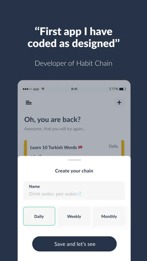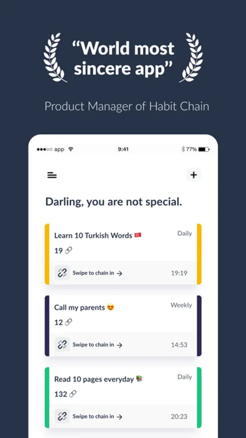 We believe if you break your routine & habit, it’s more likely to become an old habit. That’s why you’re close to zero only one. You can track, commit and gain habits with Habit Chain.
