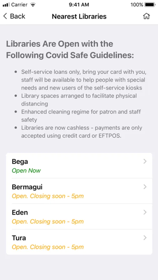 Access Bega Valley Shire Library from your iPhone, iPad or iPod Touch. Manage your account, search the catalogue, renew and reserve books, DVD’s and CD’s. Discover FREE eBooks, audiobooks, digital magazines, movies and TV series. Browse local history images, register for events and keep in touch with news and programs.