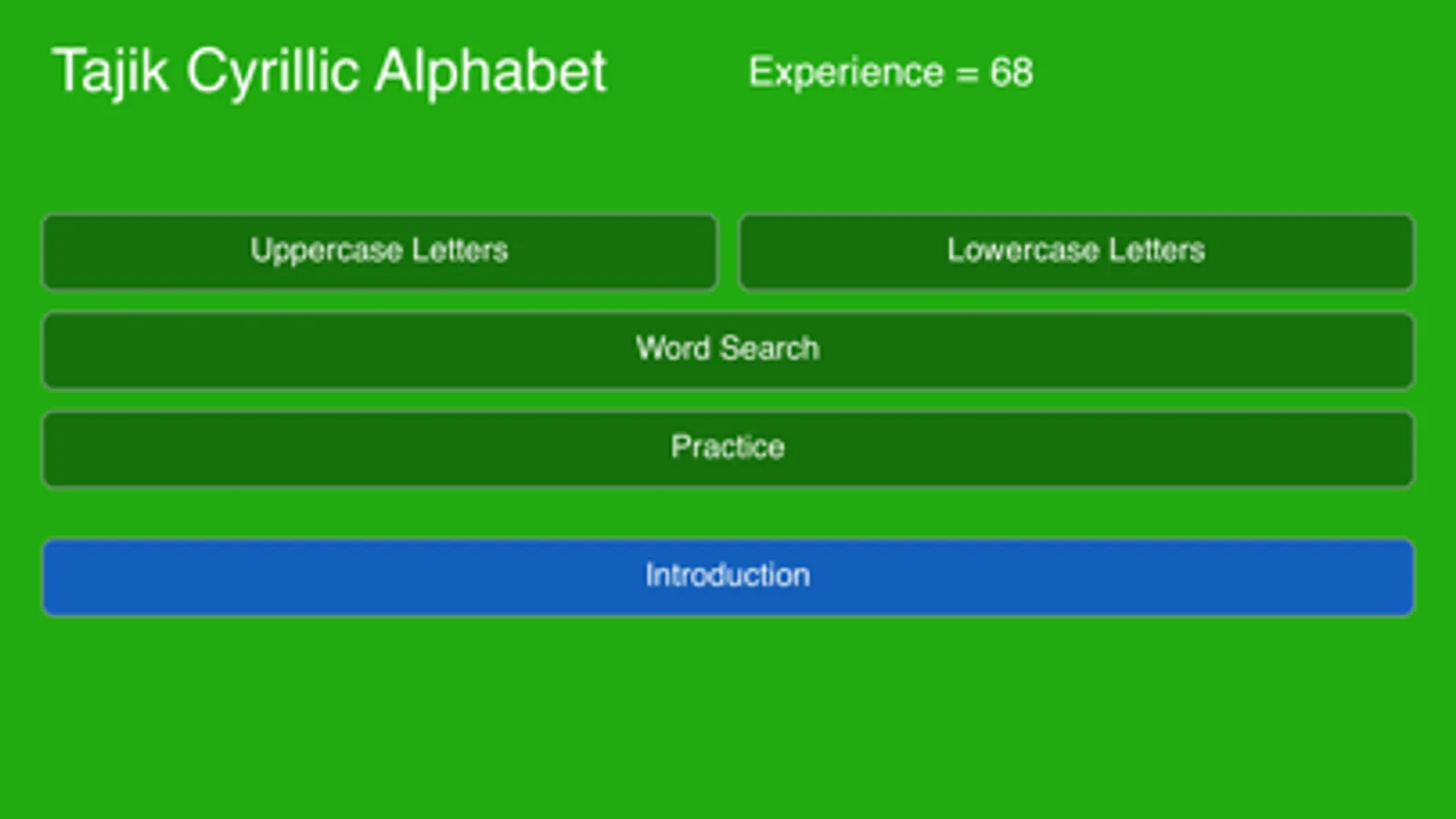 The Tajik Cyrillic alphabet app has the following sections: