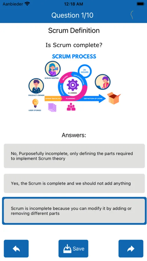 Welcome to the Scrum Practice Test App. This app contains 100 Scrum questions, along with explanation of the answer.
