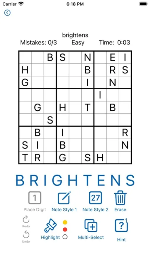 Advanced note features for more difficult levels include 2 styles of notes and cell highlighting. Notes automatically update when a character is placed. Drag to highlight multiple cells, or use a hint if you get stuck! Also options for multi-cell selection and undo/redo functionality.