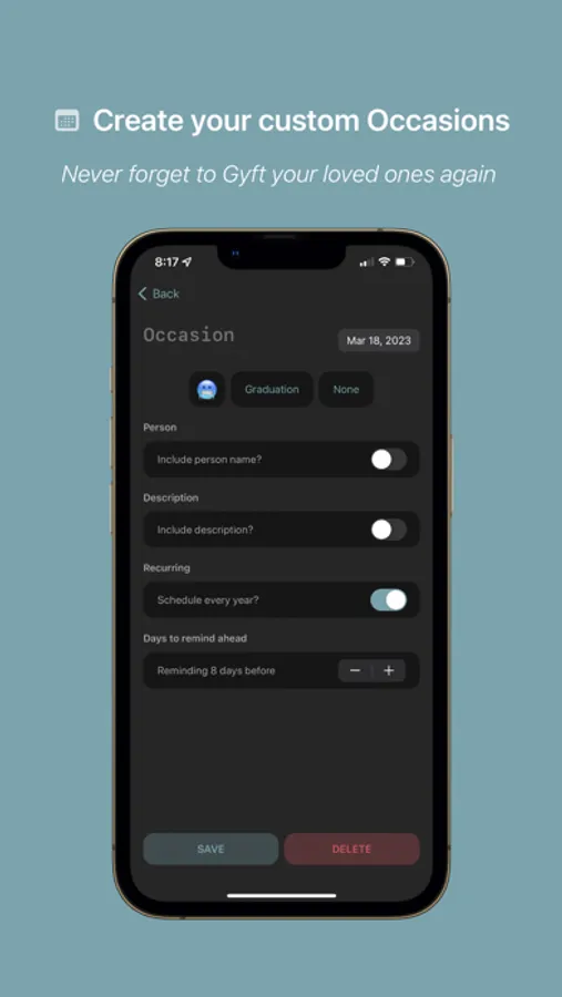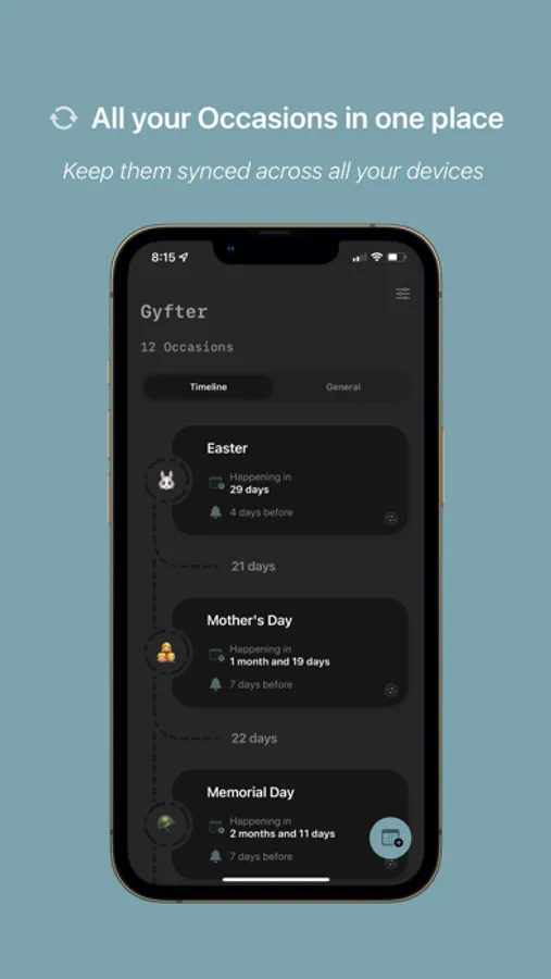 Simply add your custom occasions, combined with the globally accepted Gyfting dates already predefined in the app and never forget to "Gyft" a loved one. Get notified well before the occasion so have time to plan the most epic Gyft ever.