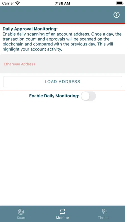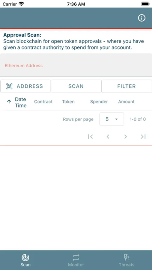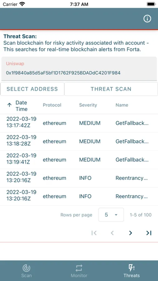 2) THREATS: in the 'Threats' tab users can scan alerts for any address (for example a definite decentralized exchange / DEX) to review any alerts associated with the address. For example this would alert you to low liquidity in the DEX which could indicate that it's risky to to business with them. Or it can, for example, alert you that the contract we created anonymously which indicates its a likely scam token.
