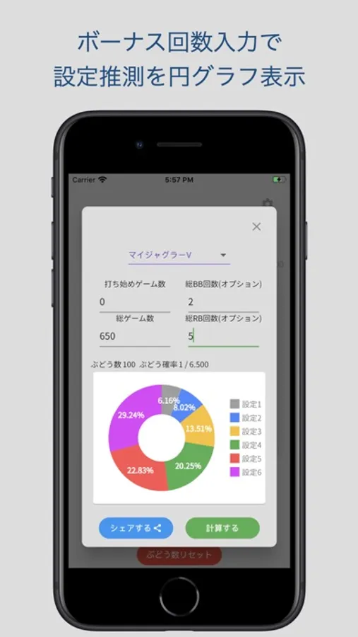 また、この円グラフをシェアすることで、画像を友達と共有したり、SNSに設定推測の結果を投稿することができます。